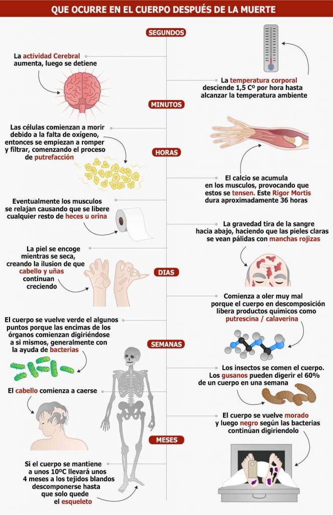 Vivimos con y gracias a nuestro cuerpo, por lo que nos pasamos mucho tiempo cuidandonos para alargar la vida o simplemente para disfrutar de una vida saludable y comoda. Pero algunas personas, dentro de su curiosidad, desean saber que le sucede al cuerpo cuando ya no podemos cuidarlo, ni él cuidarse o mantenerse a si mismo, a partir del momento de la muerte.